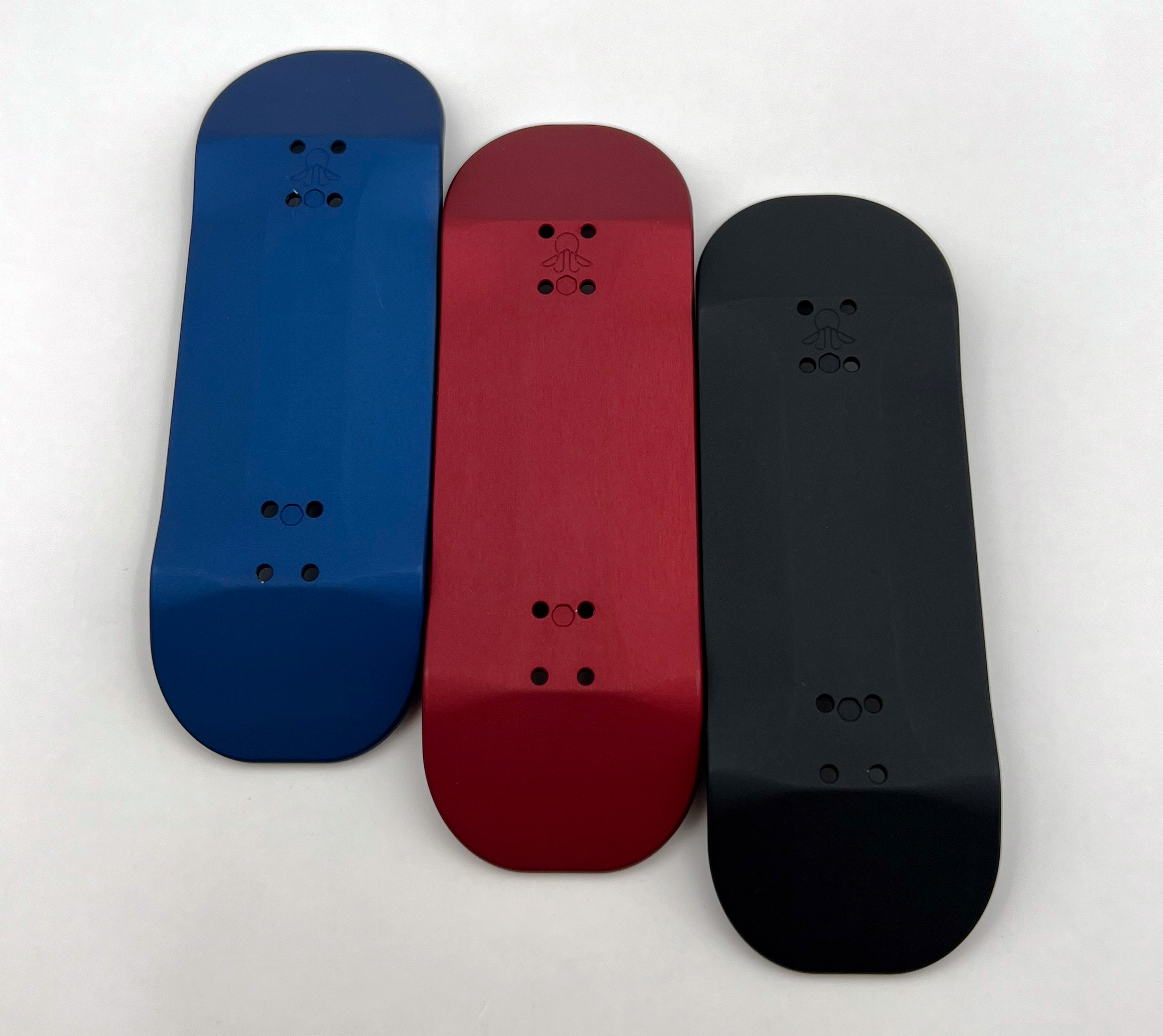 I 3D CNC machine these decks out of solid 6061 aluminum plates, then manually texture the surface by either sandblasting or polish them. Changing the surface finish yields a different finish color tone after anodizing.