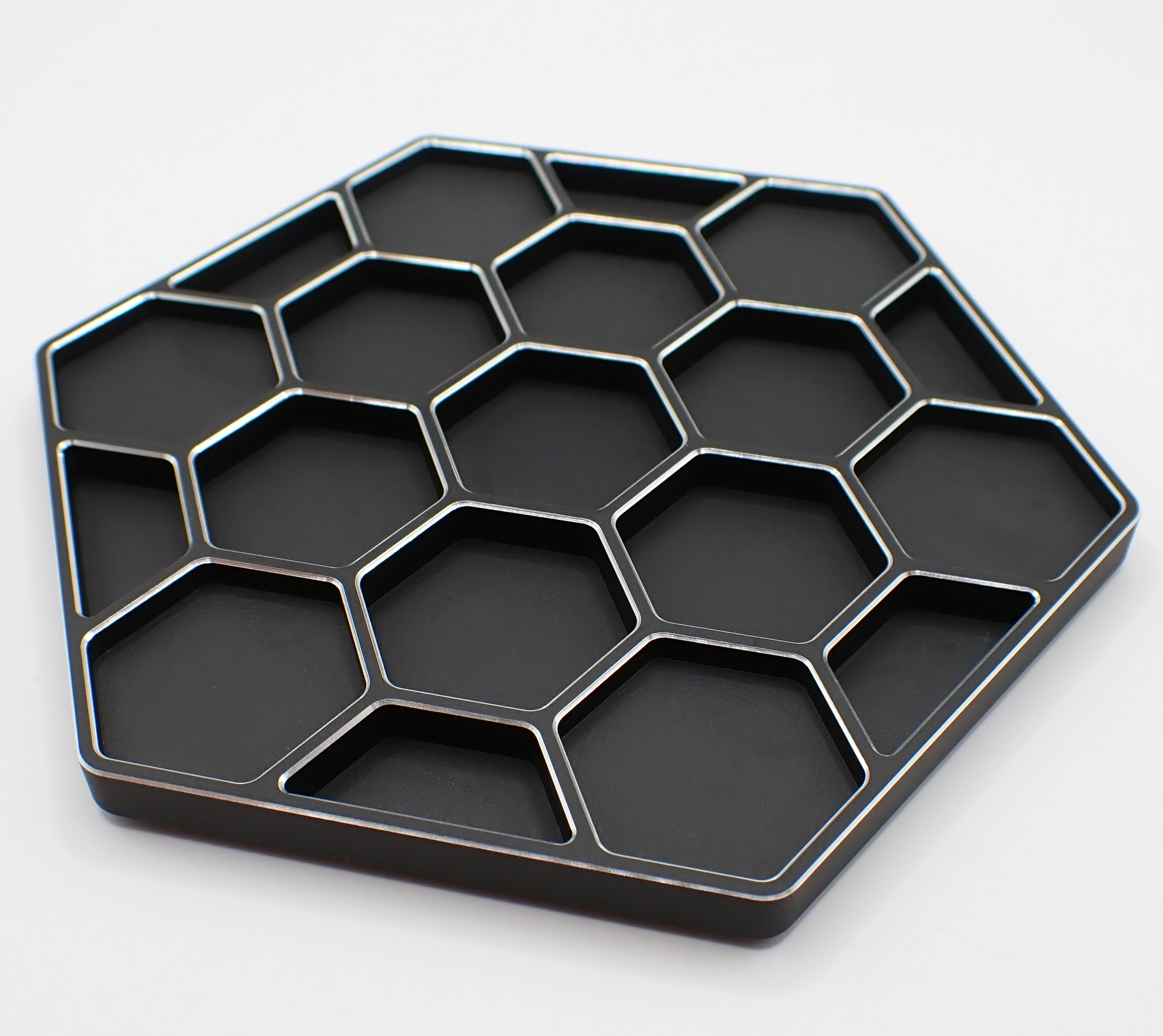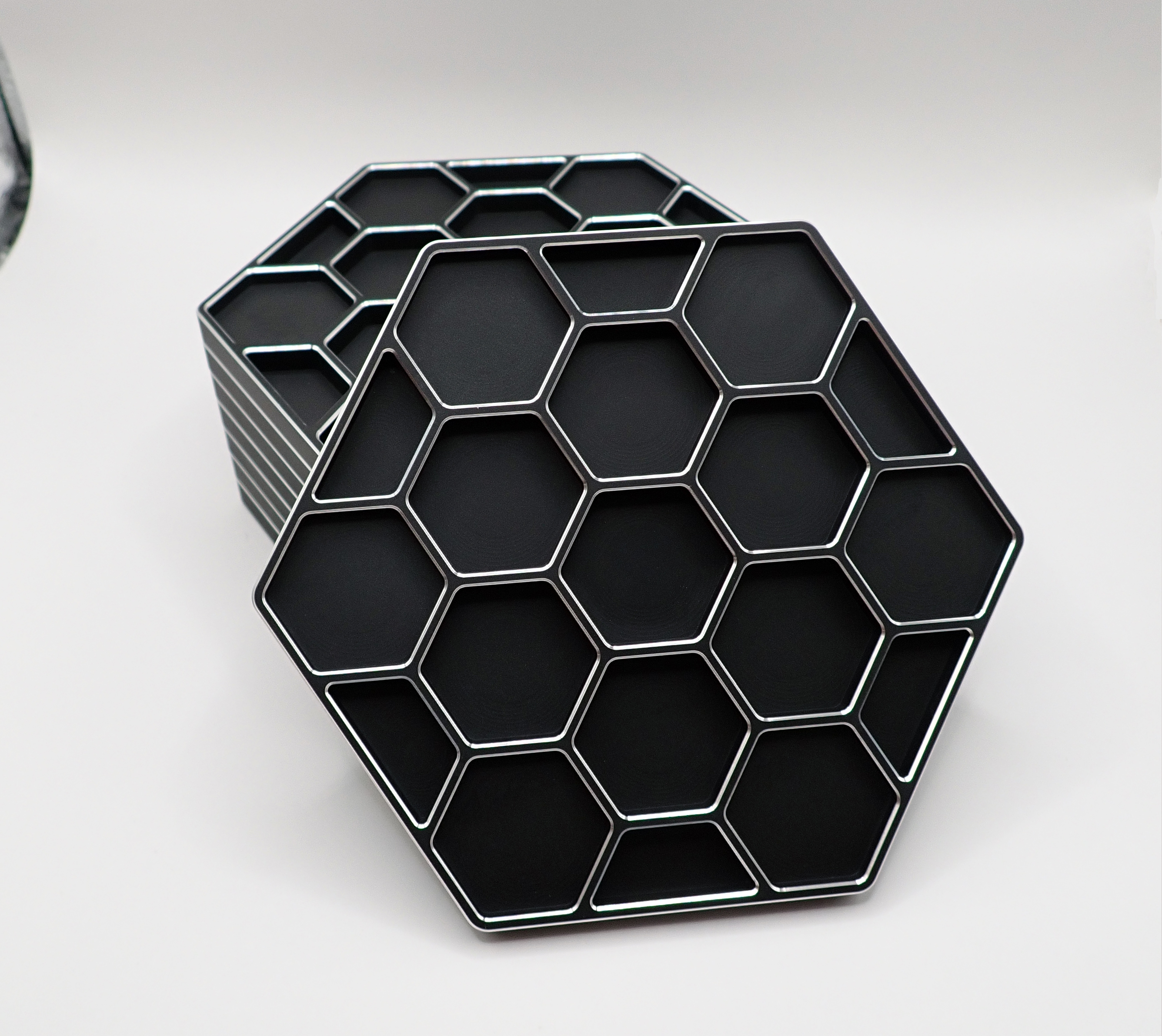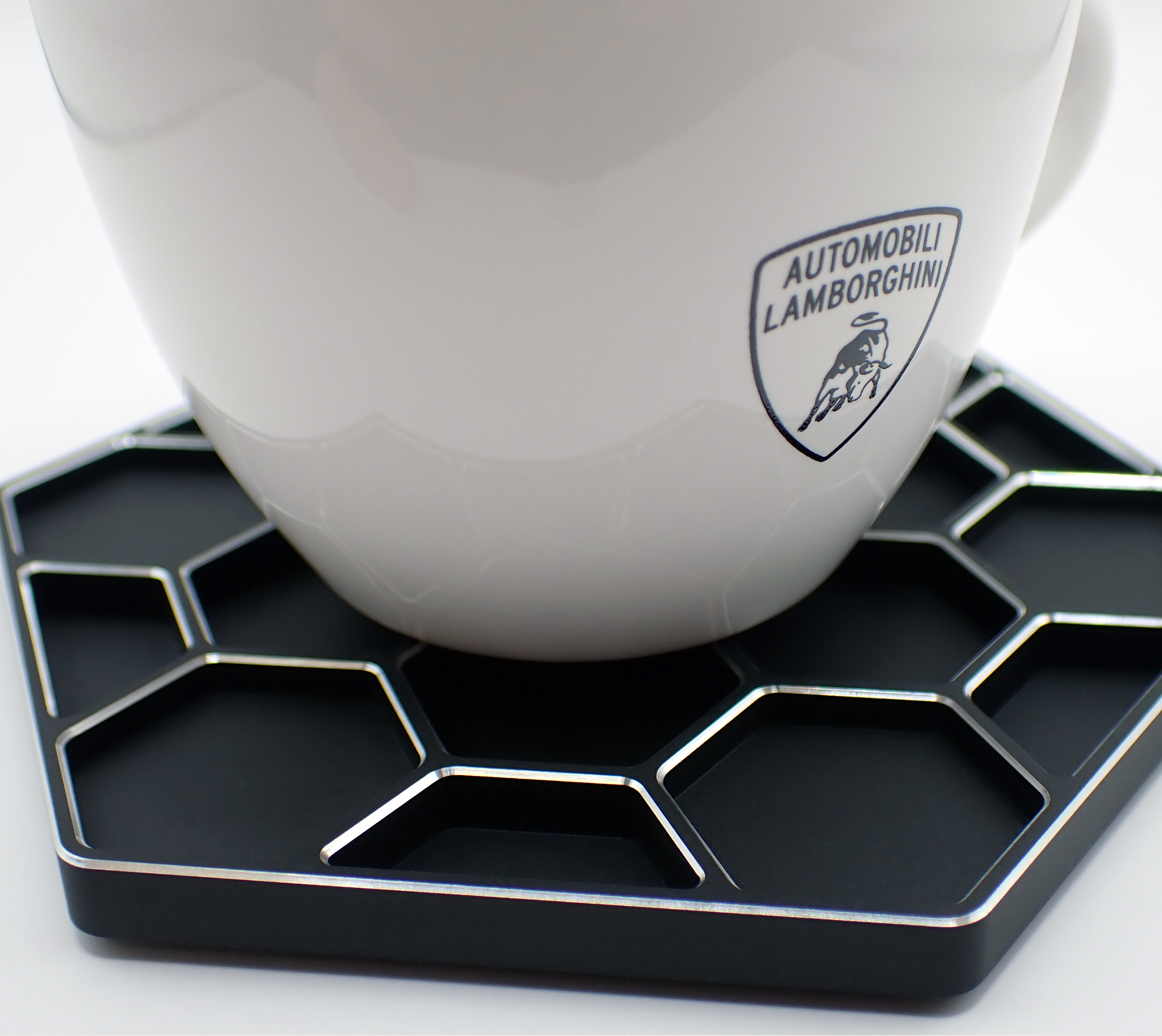 This aerospace-inspired coaster employs an honeycomb hexagonal structure which helps with weight reduction while maintaining its overall strength.
