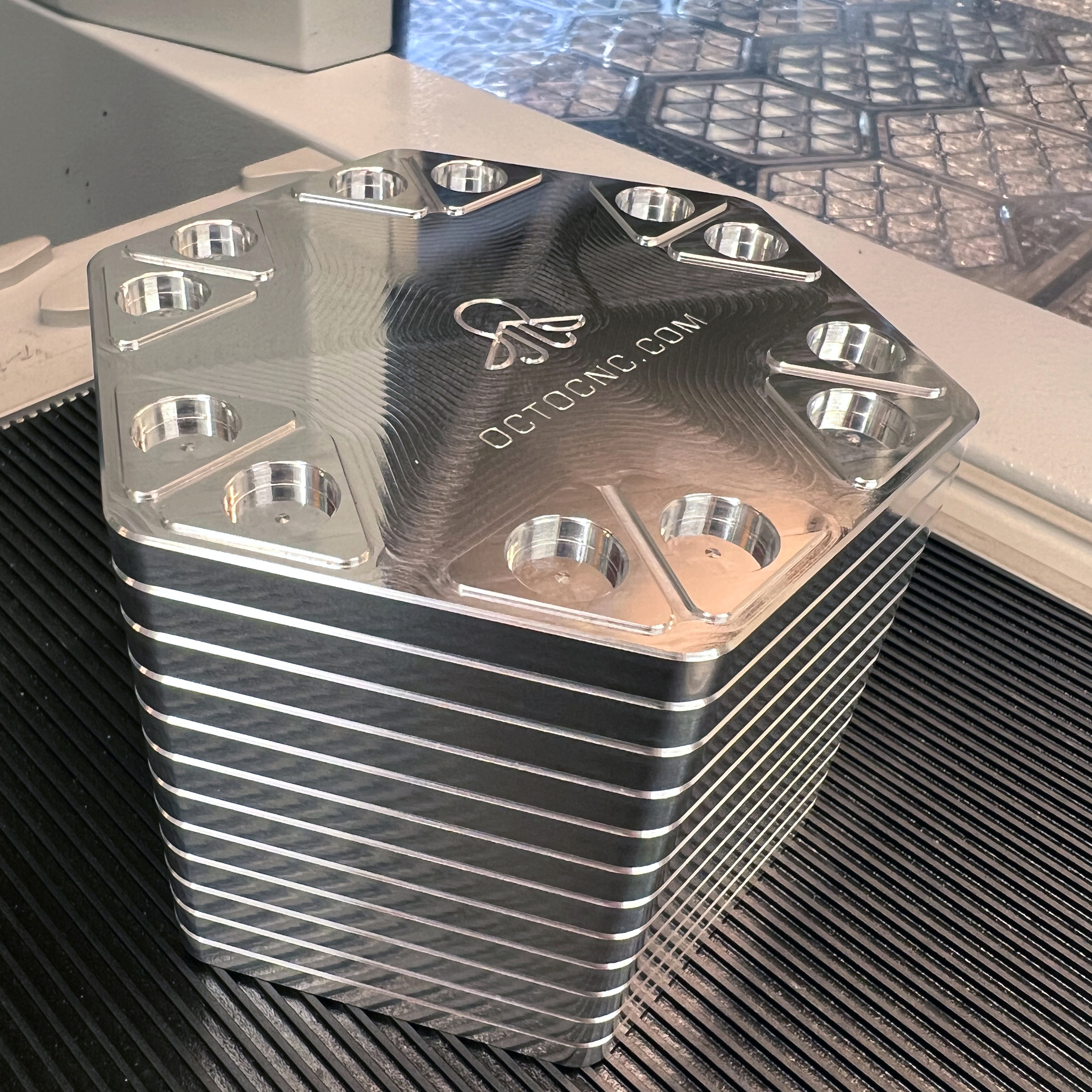 Signature Octocnc secondary machining for high contrast chamfers and engraving.